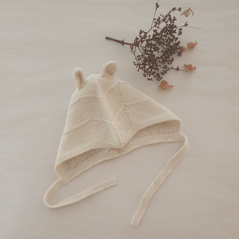 Bonnet with ears strikket i det blødeste alpaca uld. Den har en god pasform og er dejlig varm til den kolde tid – samtidig med at den er super sød.
