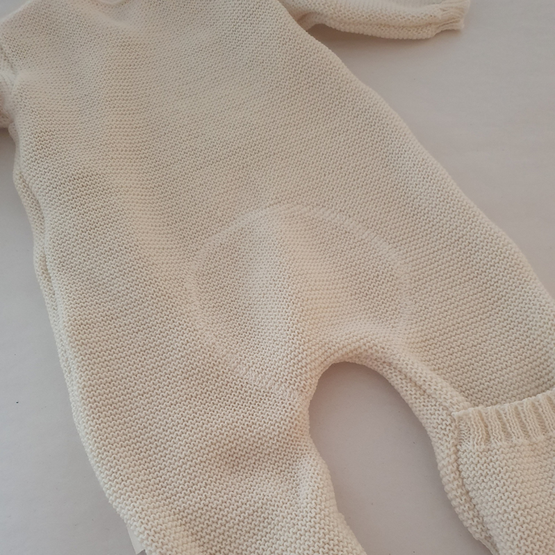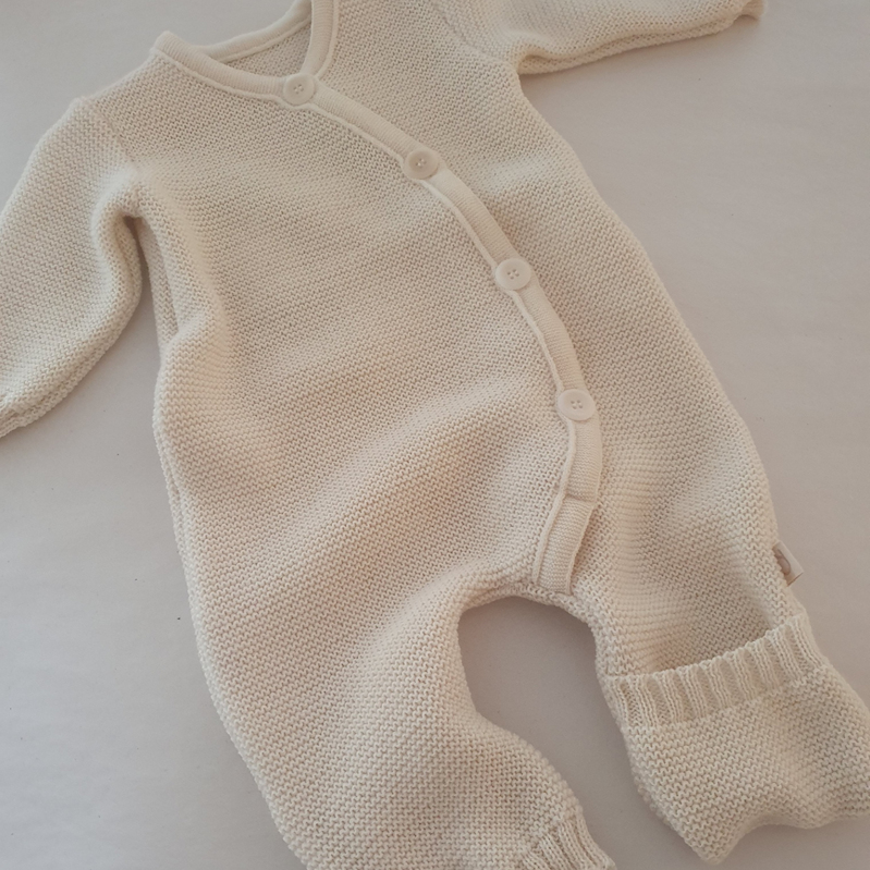 Super lækker strik dragt i KbT certificeret BIO uld, dragten er med ombuk ved fødder , og har matchende knapper. Jeg anbefaler håndvask.