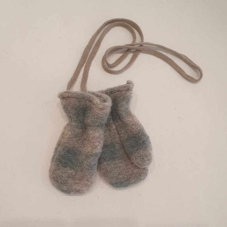 Uldfleece vanter i karo mønster i Salvie/Sand med snor til gennem ærmerne, så vanterne ikke bliver væk. Vanterne er med tommeltot i alle 3 størrelser.